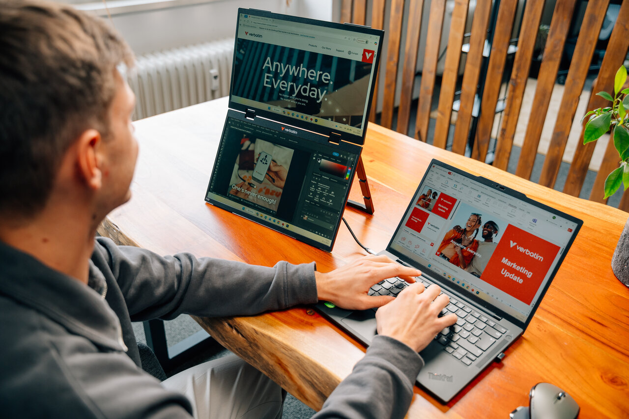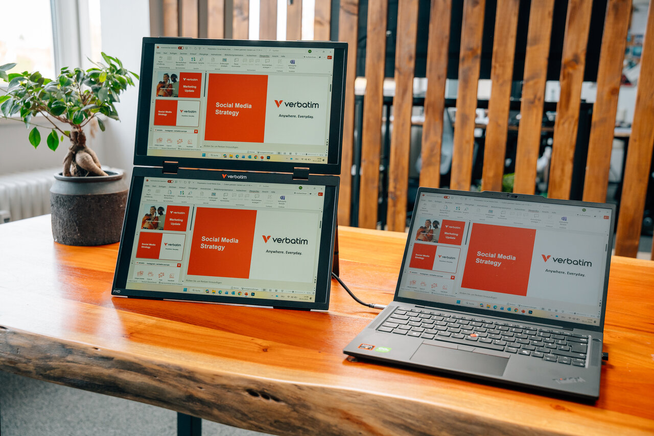 Ob du im Büro, von zu Hause aus oder unterwegs arbeitest, der Verbatim Portable 15,6" FHD Dual Monitor Essentials bietet eine flexible, kompakte Lösung zur Erweiterung deines Arbeitsbereichs. Mit zwei vertikal gestapelten Bildschirmen und der Unterstützung für mehrere Anzeigemodi - darunter Extend*, Duplicate und Ultra Mode (nur Windows) - passt er sich nahtlos an deinen Arbeitsablauf an. Dank seines schlanken und leichten Designs kannst du deine Produktivität maximieren, ohne Kompromisse beim Platzbedarf einzugehen.