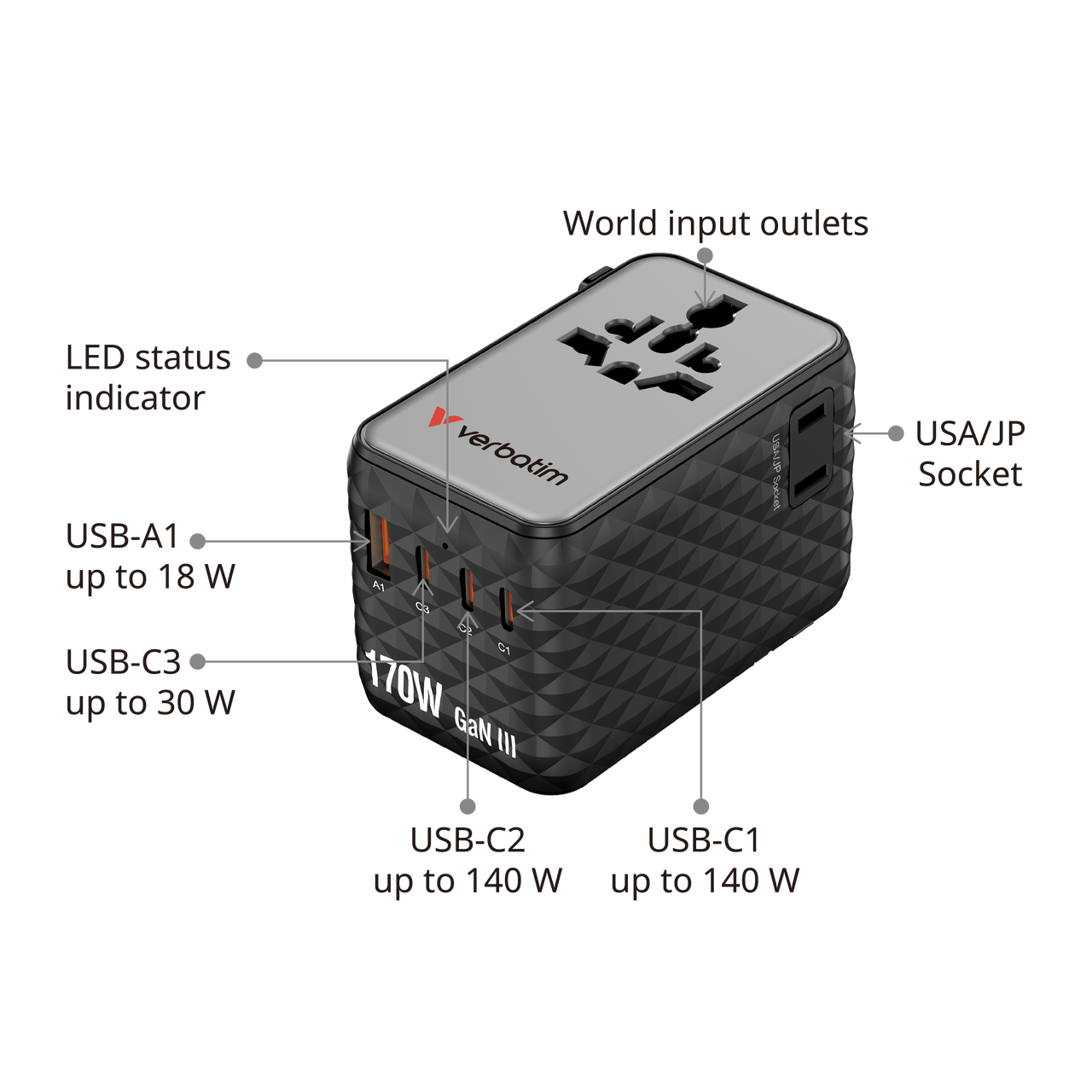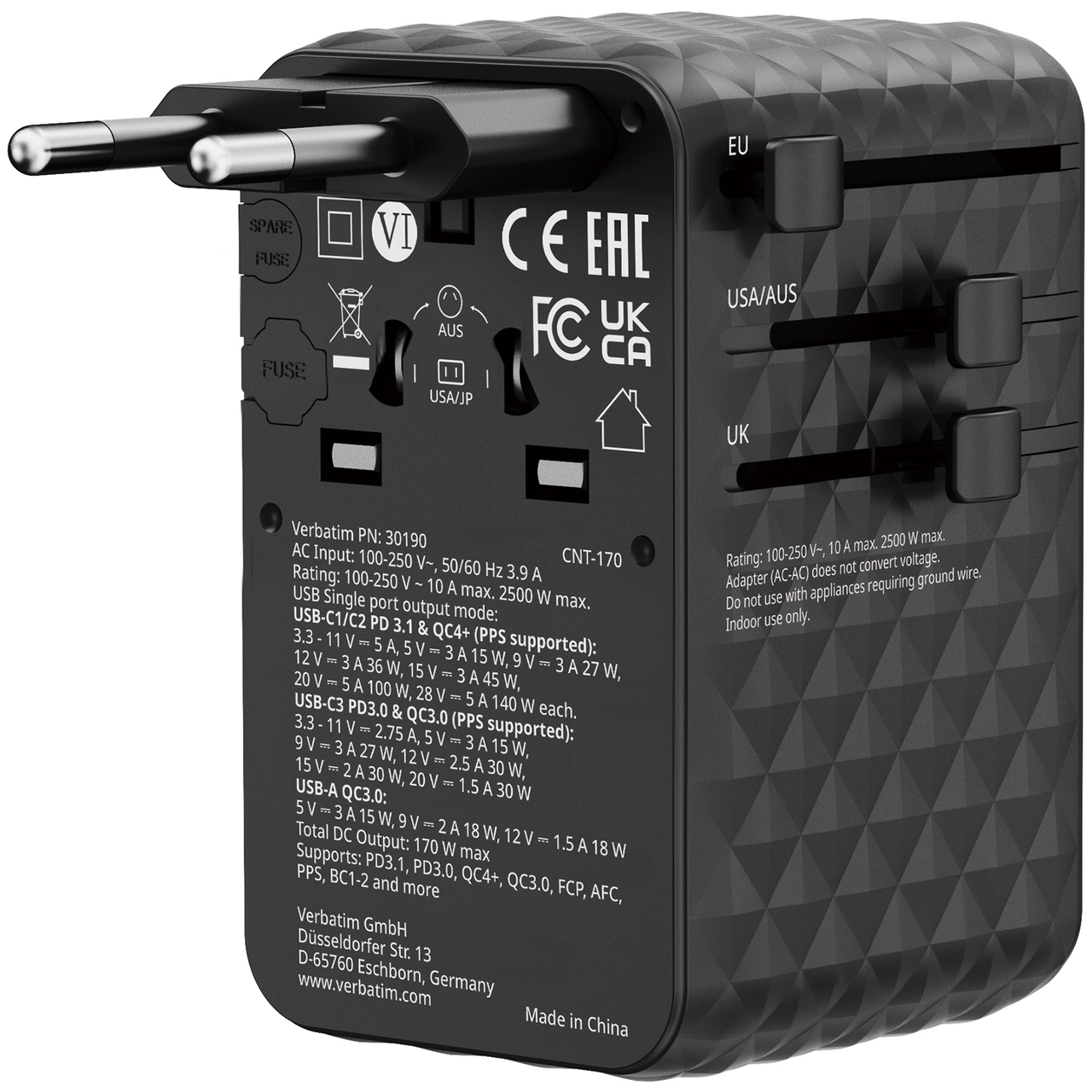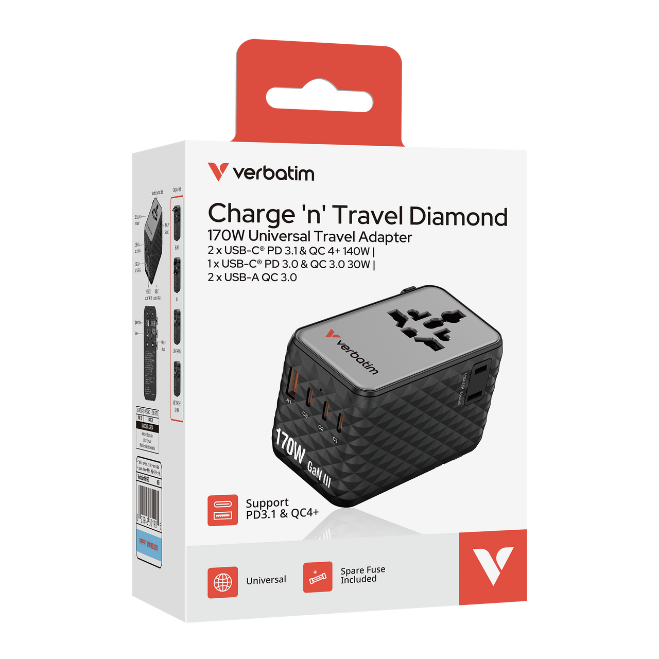 Verbatim Charge 'n' Travel Diamond 170W GaN III Universal Travel Adapter
