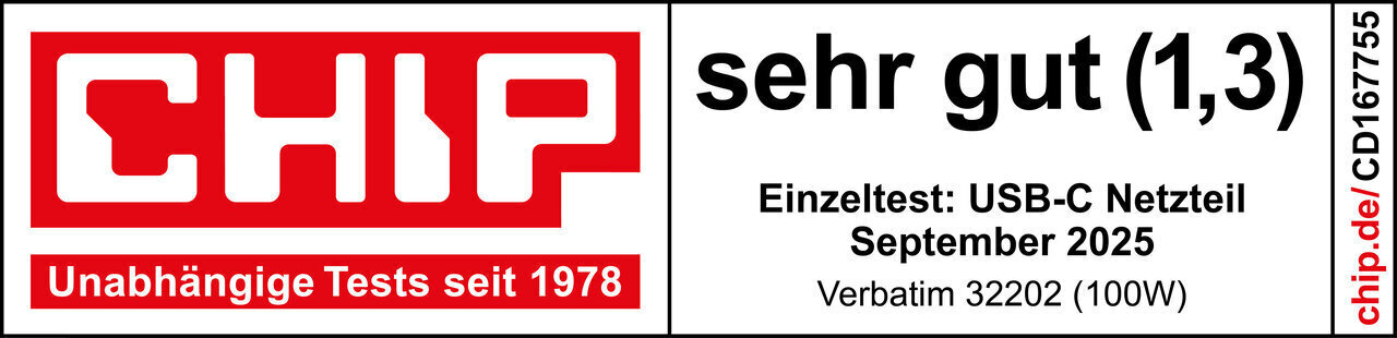 Das 100-W-GaN-Ladegerät von Verbatim vereint mehrere Ladegeräte in einem einzigen Gerät: zwei USB-C PD 100-W-Anschlüsse, einen USB-C PD 65-W-Anschluss und einen USB-A QC 3.0 (EU/UK/US)-Anschluss gemeinsam in einem schlanken, gerade handtellergroßen Design. Dieses Ladegerät ist damit ideal zum Laden von Laptops, Tablets, Smartphones, Spielkonsolen usw. – im Büro, zu Hause oder unterwegs.