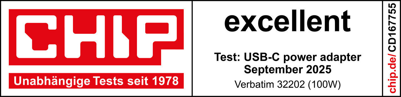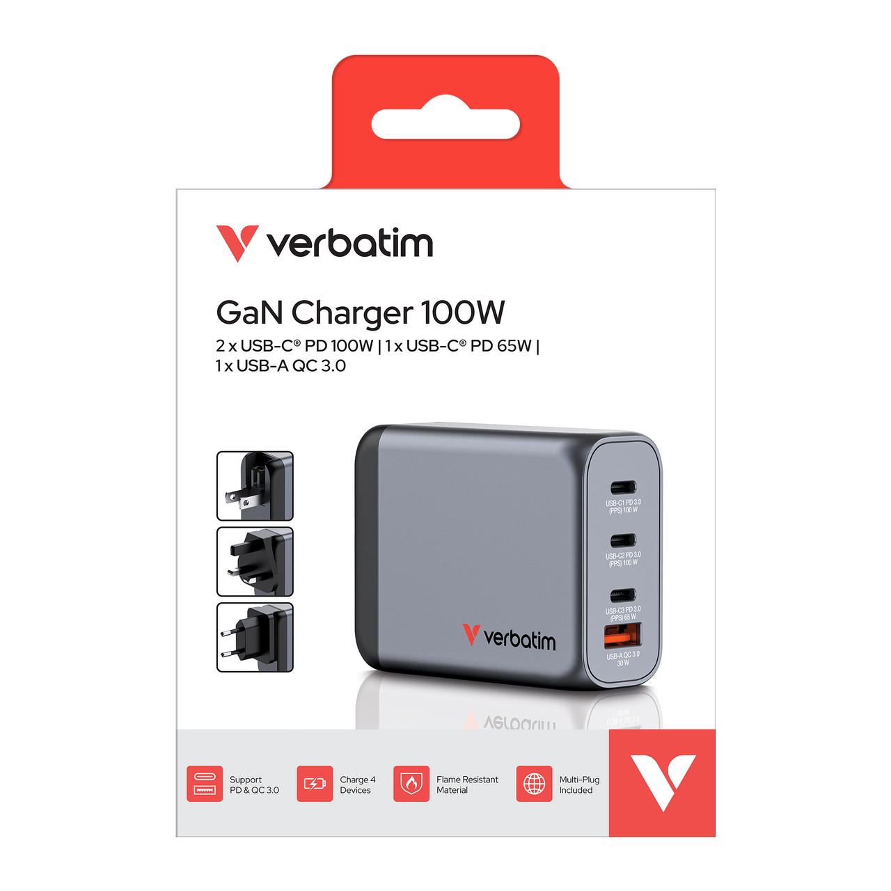 Verbatim’s 100W GaN Wall Charger consolidates multiple chargers into one, combining two USB-C PD 100W ports, one USB-C PD 65W port and one USB-A QC 3.0 (EU/UK/US) port in a sleek, palm sized design. Ideal for the office, home or travelling to power your laptop, tablet, smartphone, gaming devices, and more.