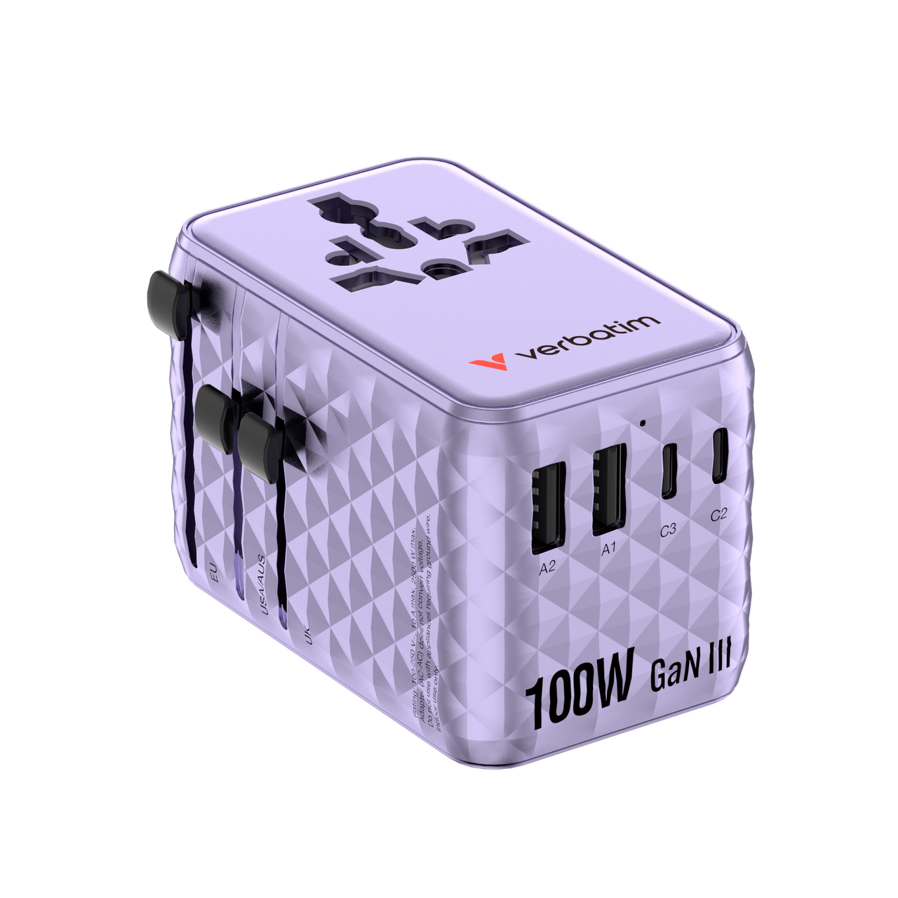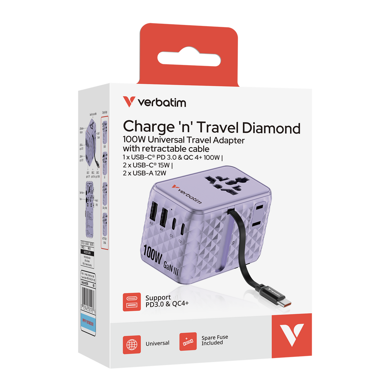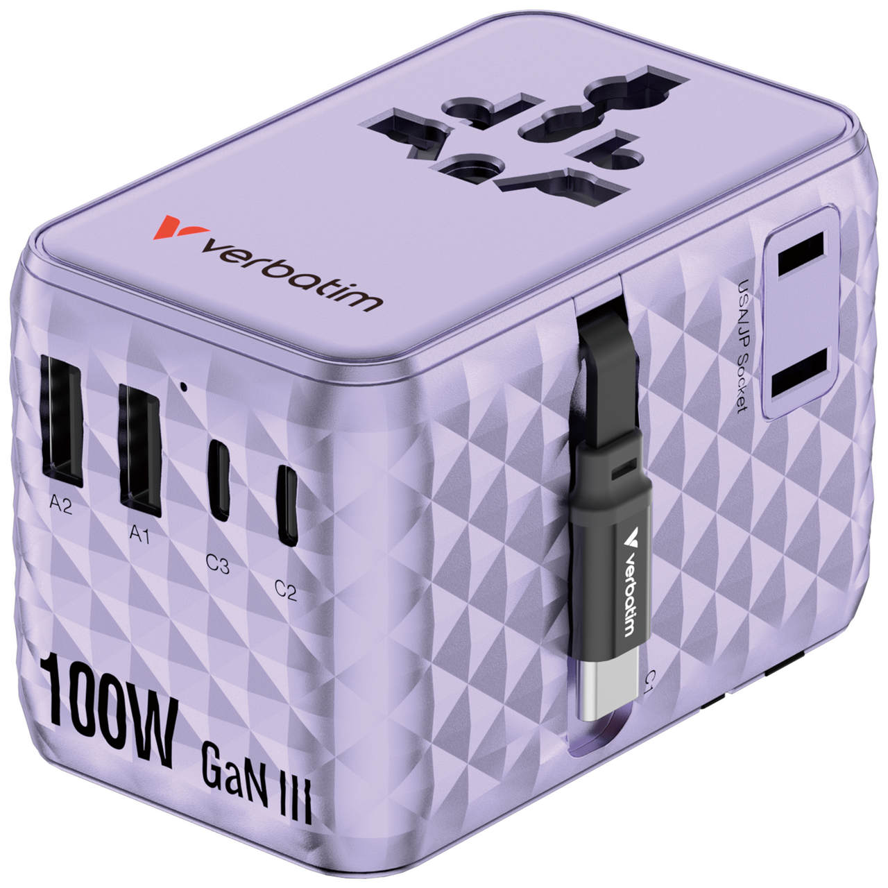 Verbatim Charge 'n' Travel 100W GaN III universell reseadapter med infällbar USB-C-kabel