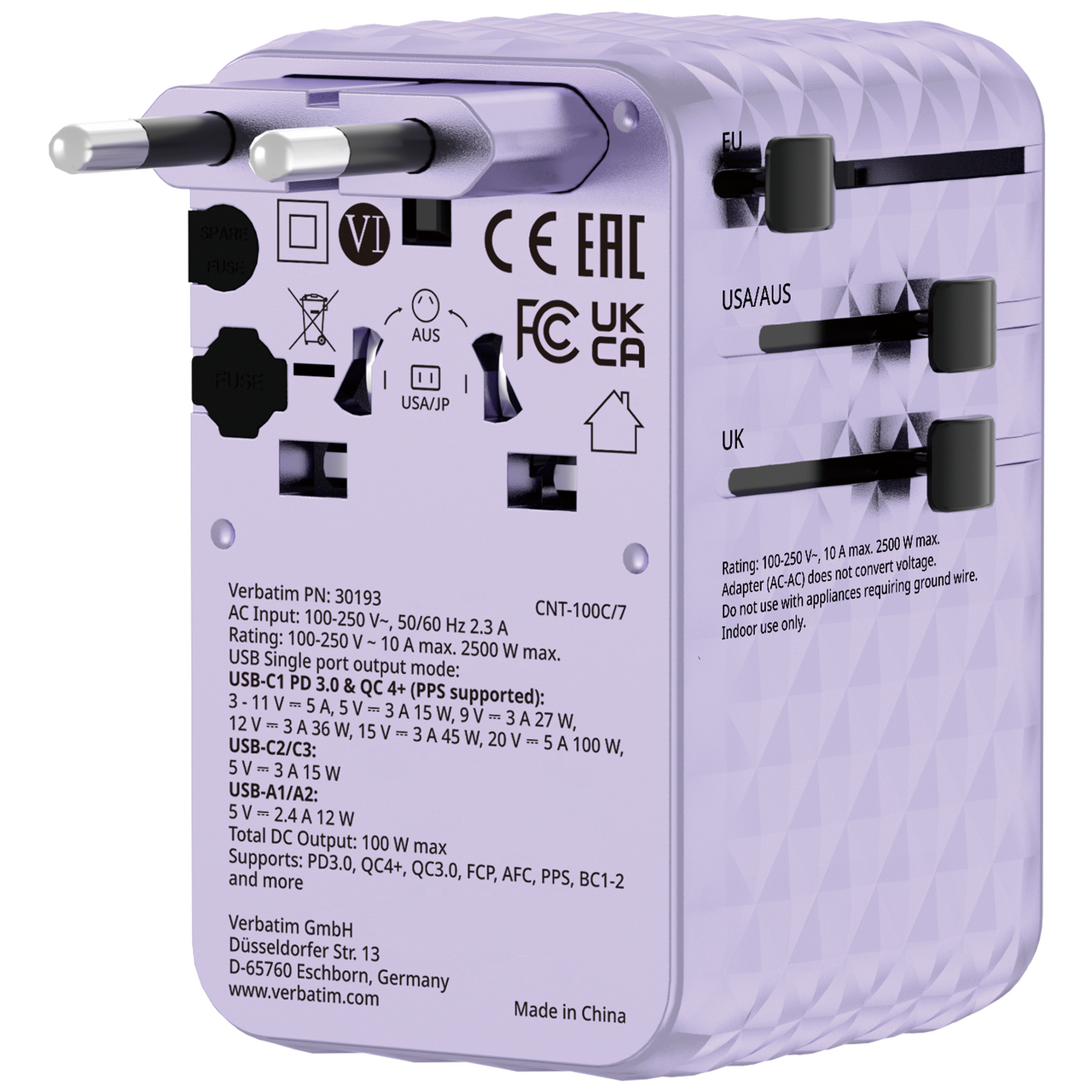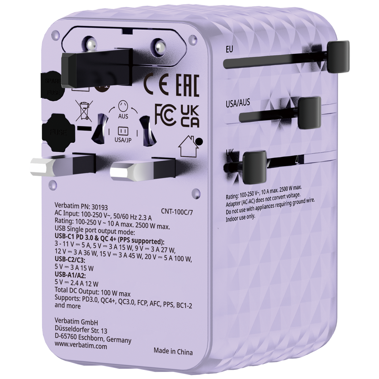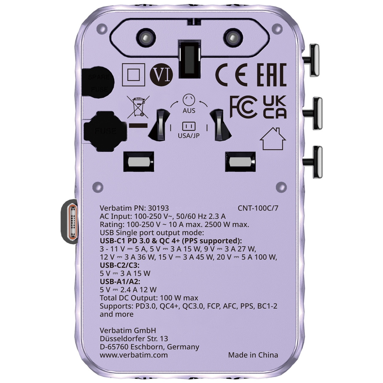 Verbatim Charge 'n' Travel 100W GaN III universell reseadapter med infällbar USB-C-kabel
