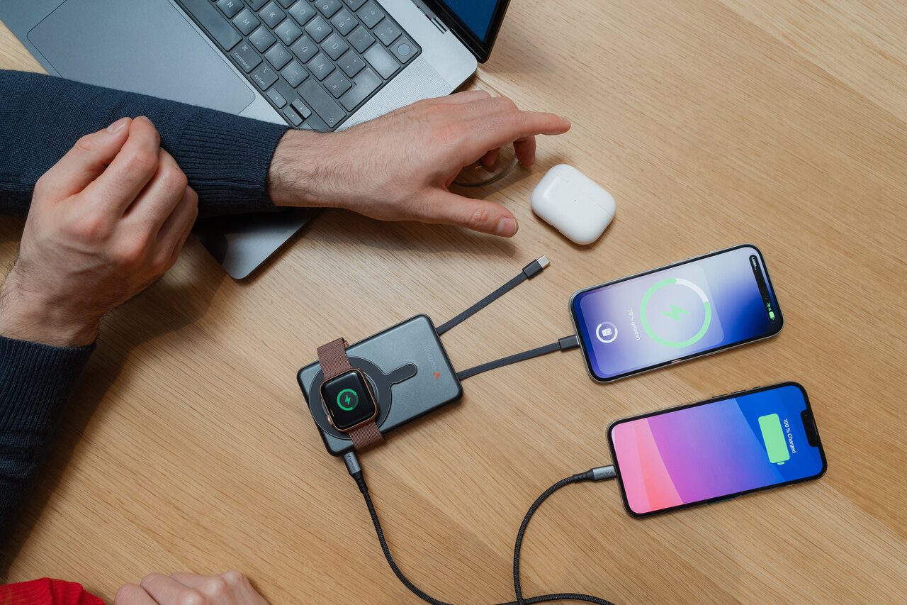 Slipp trassliga kablar och njut av sömlös trådlös laddning med Charge 'n' Go Power Bank. Den är utrustad med magnetisk inriktning för MagSafe-enheter och levererar upp till 15 W för telefoner*, plus dedikerade utgångar för AirPods™ och Apple Watch™. Android-användare lämnas inte på efterkälken - Qi-kompatibel trådlös laddning ger samma enkla upplevelse. Ladda din telefon medan den står på stödbenet, surfa eller streama och håll dig fulladdad utan att avbryta din dag.