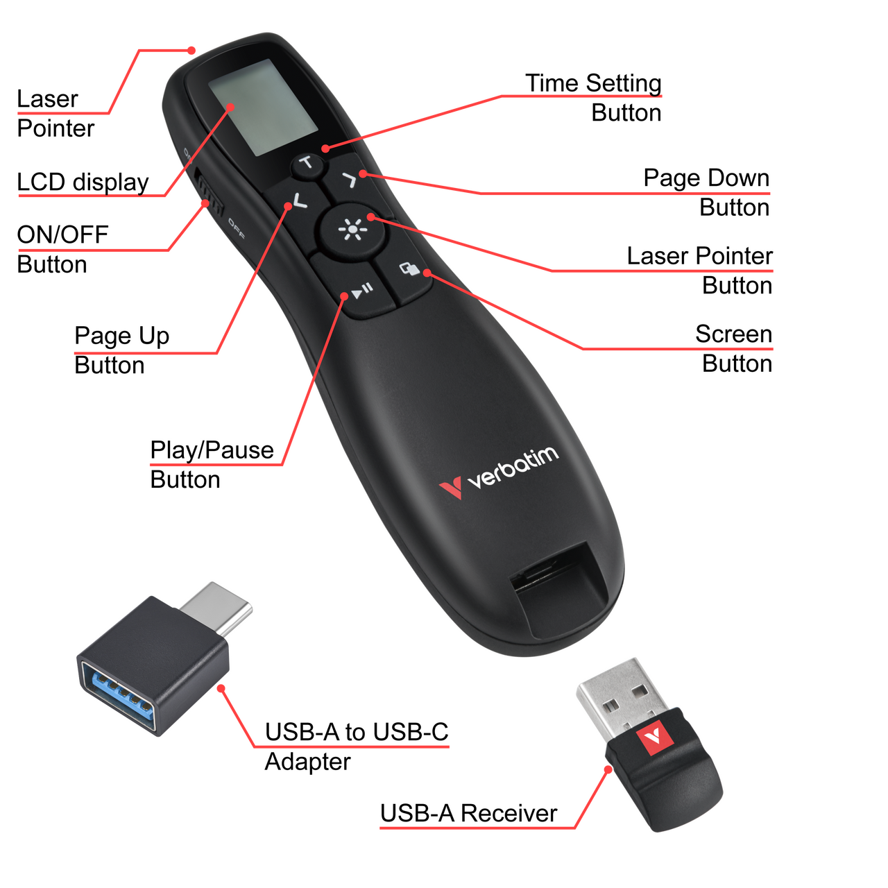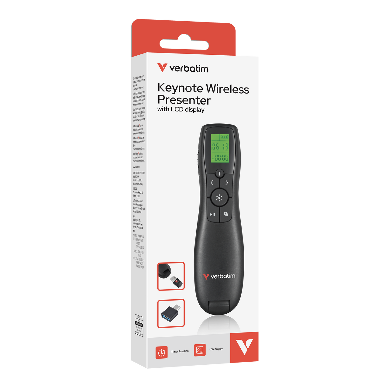 Verbatim Keynote Wireless Presenter säkerställer att din presentation inte bara levererar rätt budskap utan också avslutas i rätt tid.  Den integrerade LCD-skärmen visar en live nedräkningstimer, så du är alltid medveten om hur mycket tid du har kvar. Oavsett om du leder en klass, levererar en företagspitch eller är värd för ett webbinarium hjälper det inbyggda larmet dig att hantera tempot utan att titta på klockan eller telefonen. Med tydlig synlighet på skärmen och taktil kontroll kan du fokusera på det som verkligen betyder något - att få kontakt med din publik.