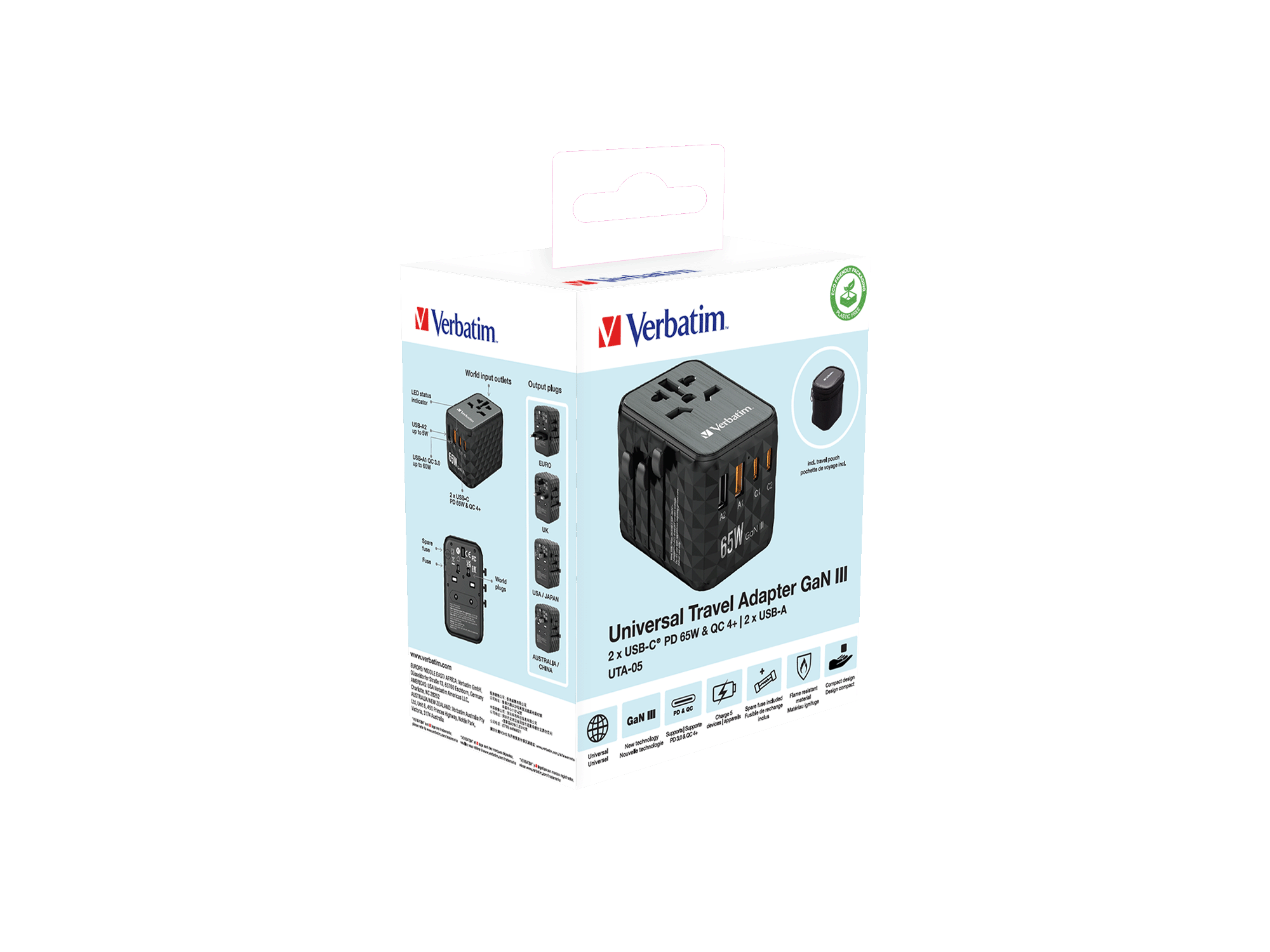 - Verbatim 2 x USB-C PD 65W ve QC 4+ / 2 x USB-A ile UTA-05 GaN III Evrensel Seyahat Adaptörü